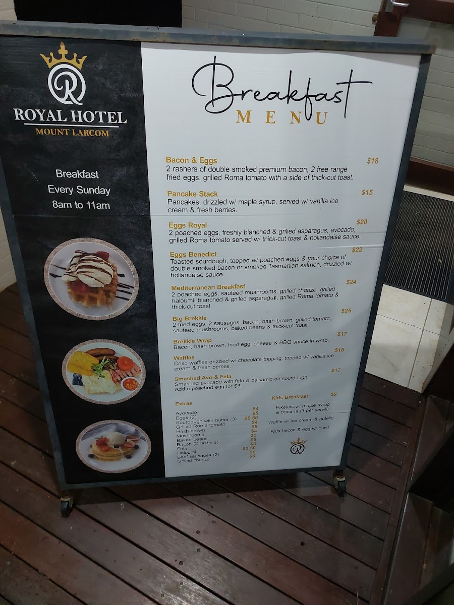 Welcome to Mount Larcom Cafe, a hidden gem nestled at 33 Raglan St, Mount Larcom, QLD. Here, you’ll discover a breakfast menu that caters to all tastes, featuring tempting options like the hearty Big Brekkie for A$18, and the elegant Eggs Royal. The Pancake Stack and Smashed Avo & Feta invite you to indulge, while extras like grilled chorizo and haloumi enrich your meal.